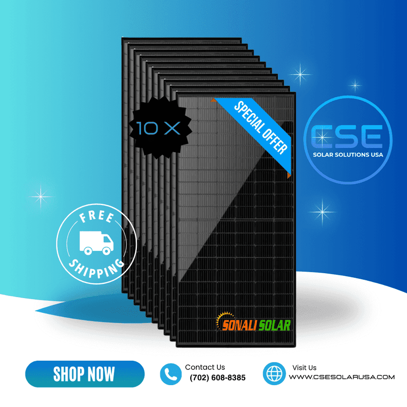 10X Sonali, 390W PV Module, MC4 Compatible, 1200mm (~47”) PV Wire, 35mm Black Frame, Black Sheet, BOB, 108 Mono 1/2 Cell, 25A Fuse, 1500VDC, No PTC, 25/25 Warranty, SS-M-390-B