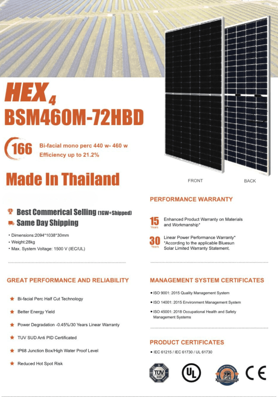 460W Bi-facial Mono Perc Half Cut Technology Panels for optimal energy yield and efficiency. 144 Monocrystalline cells with enhanced reliability and better micro-crack resistance. Anodized aluminum alloy frame. IP68 junction box for high waterproof level and reduced hot spot risk.