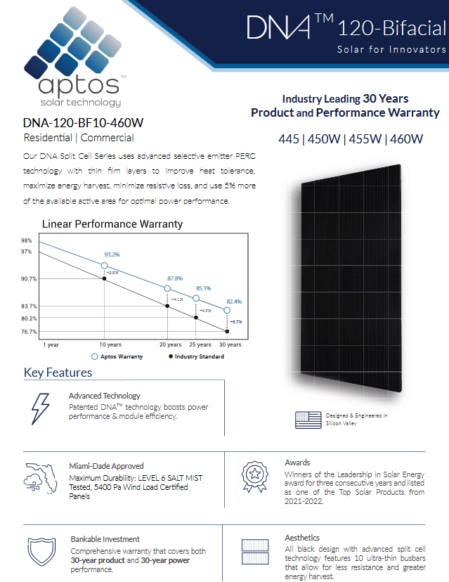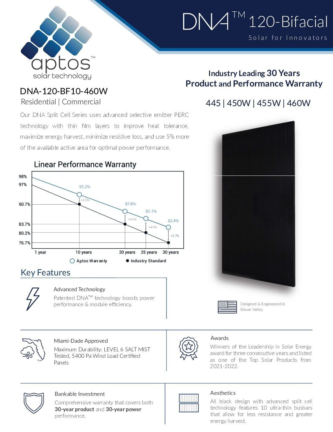 Power your next project with performance and value. This pallet of 31 Aptos DNA-120-BF10-460W bifacial solar panels delivers a total of 14.26 kW of cutting-edge solar capacity. Built with advanced monocrystalline PERC cell technology and a bifacial design, these panels increase energy production by capturing light from both sides — perfect for maximizing ROI in residential, commercial, and ground-mount applications.