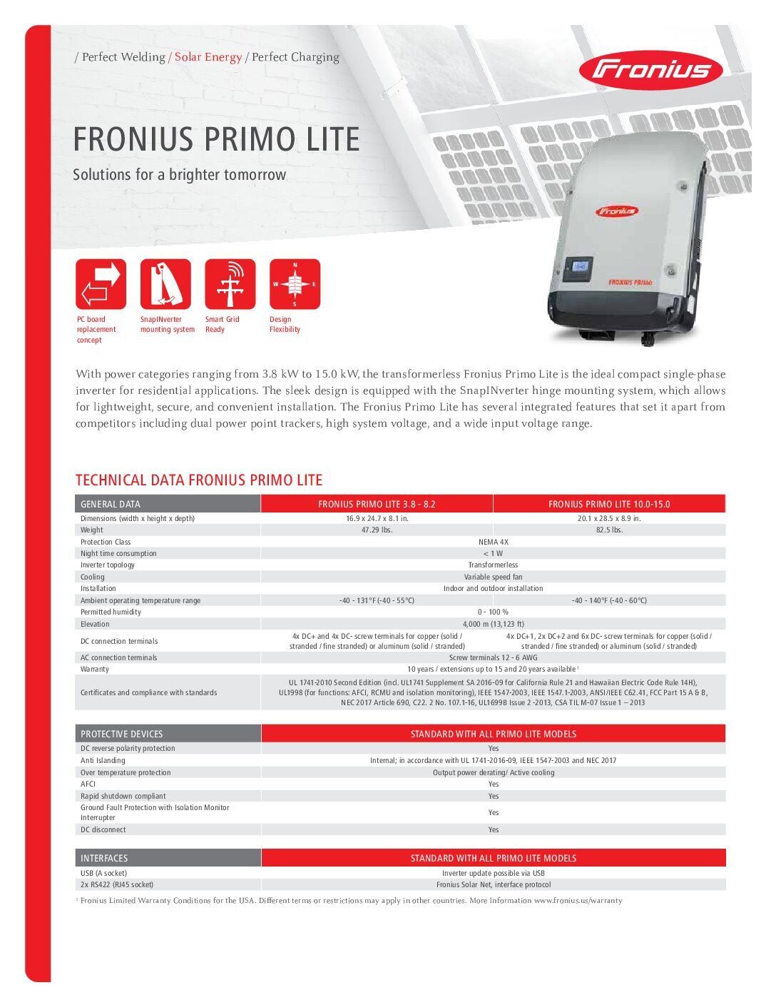 It is NEC 2011 (AFCI) and is 2014 (Rapid Shutdown) compliant and uses the Fronius standard SnapINverter Mounting system and Advanced Grid Features, making it a reliable choice for those seeking a fronius inverter.