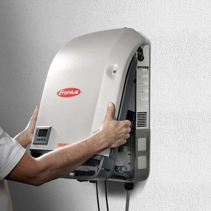 The Fronius Symo 3-phase commercial inverter is fitted with the Fronius SnapINverter hinge mounting system, which allows for tool-free attachment and removal of the inverter from the wall mounting plate and integrated detach, making large solar array installation simpler than ever. The output power ranges from 10 to 24 kW.