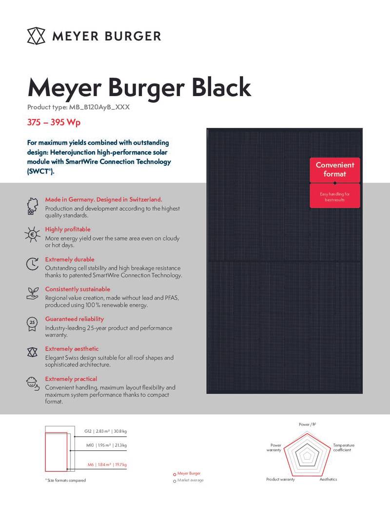 - Durable Construction: Built to withstand the elements, the Meyer Burger MB_B120AyB_385 is designed for long-lasting performance with a robust frame and high-quality materials, ensuring reliability for years to come.