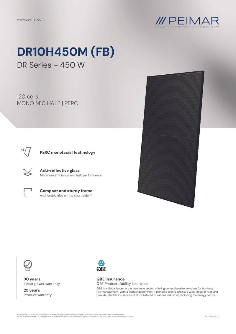 Built to withstand demanding environmental conditions, the DR10H450M supports 1500VDC systems, includes MC4-compatible connectors, and is backed by Peimar’s 30-year performance warranty and 25-year product warranty.