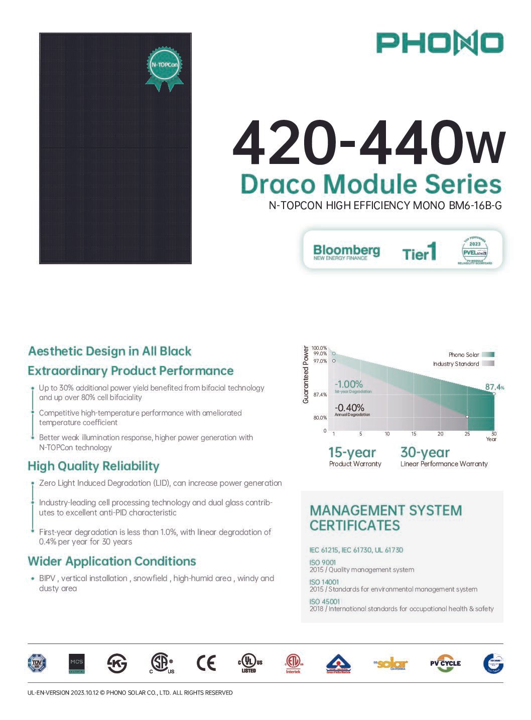 Certified by UL and CEC, this high-performance PV module guarantees long-term reliability with a 15-year product warranty and an extended 30-year linear power output warranty. Whether for grid-tied residential systems or large-scale commercial projects, the Phono Solar 440W TOPCon panel delivers maximum energy yield, exceptional temperature stability, and long-lasting solar performance.