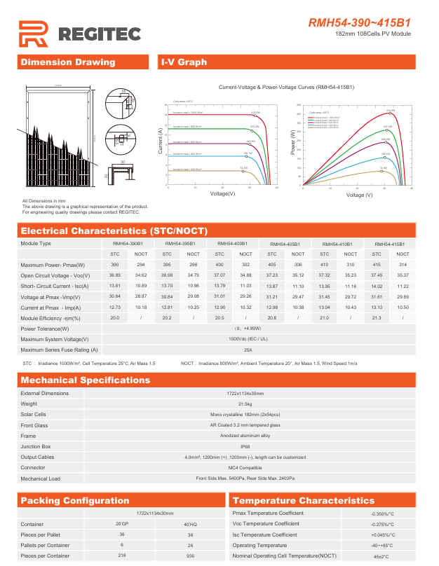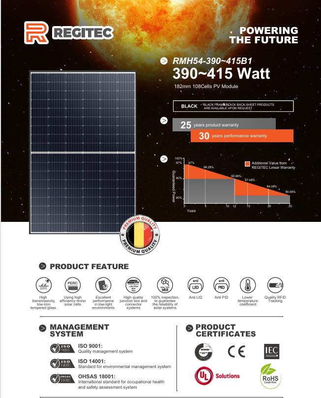 The Regitec RMH54/415B1 415W PERC Solar Panel is a high-efficiency monocrystalline module engineered for strong performance, long-term durability, and exceptional value. Designed for residential, commercial, and large-scale installations, this panel uses advanced PERC cell technology to deliver higher energy output and excellent low-light performance.