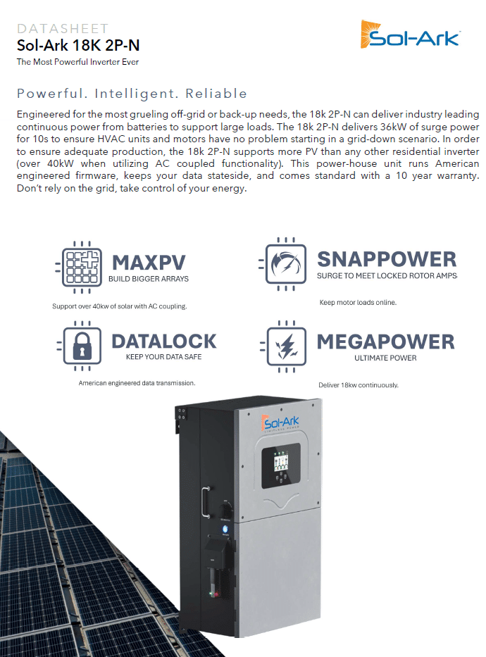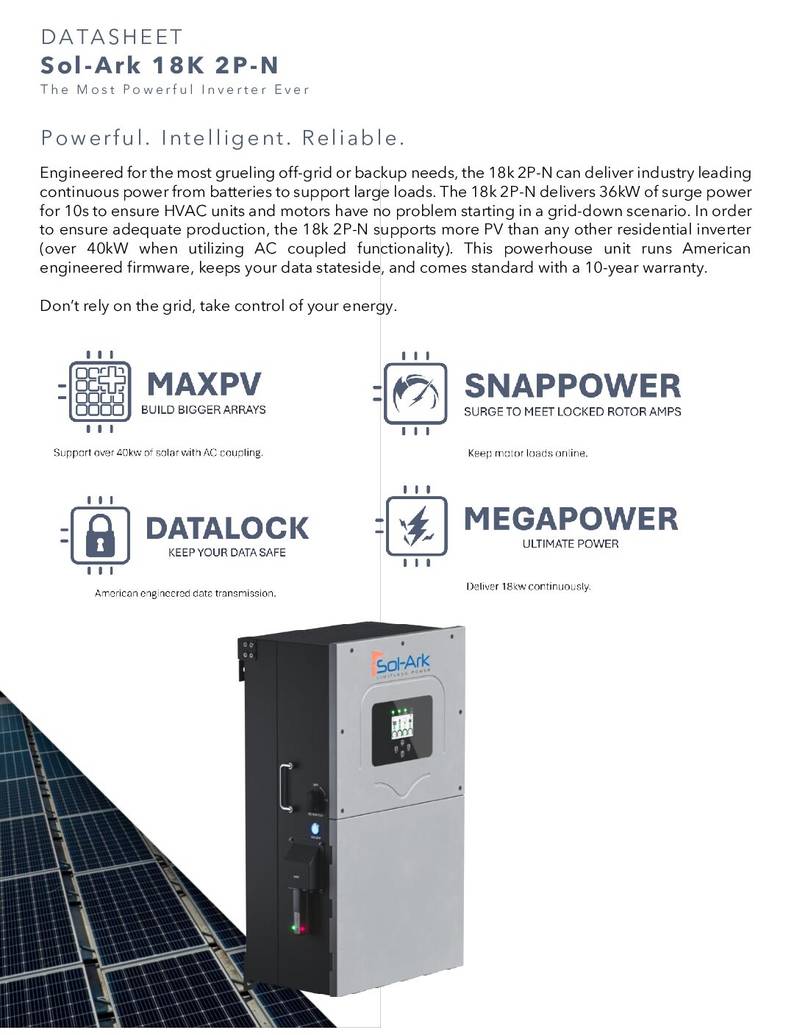 Unlock whole-home backup and peak efficiency with the Sol-Ark 18K-2P. Built for hybrid (grid-tie + battery) and true off-grid applications, this inverter is a contractor-favorite for resilient homes, small businesses, and light commercial sites. It supports AC-coupled and DC-coupled designs, integrates cleanly with lithium or lead-acid batteries, and provides fast, seamless backup when the utility fails—no manual transfer needed.