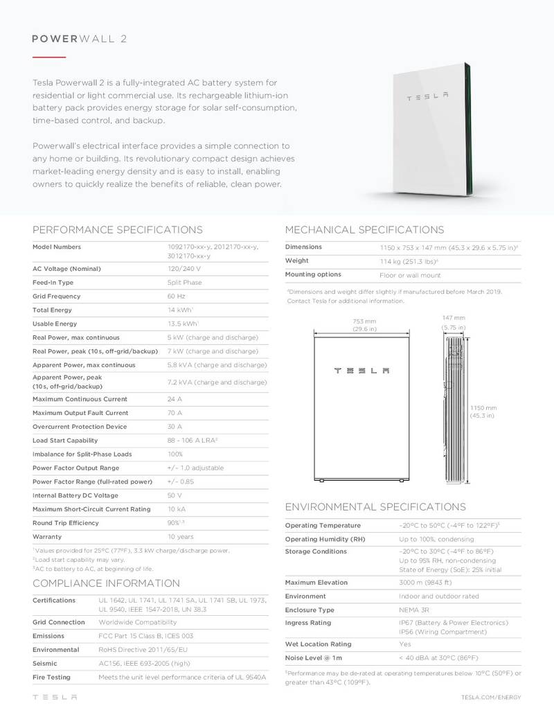 The Tesla Powerwall 2 is a powerful, reliable home battery system that stores energy for use day or night and keeps your home running during unexpected outages. With 13.5 kWh of usable capacity and a sleek, compact design, Powerwall 2 offers seamless energy storage for solar self-consumption, time-of-use load shifting, and backup power.