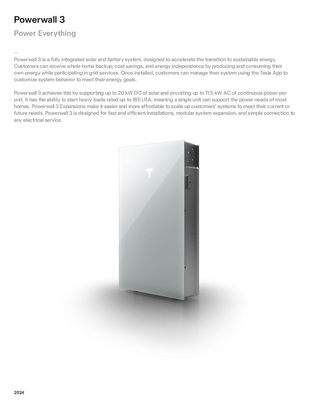 Take control of your energy future with the Tesla Powerwall 3, the next-generation home battery storage solution designed for reliable backup, energy independence, and maximum solar self-consumption. With a built-in solar inverter and 13.5 kWh of usable energy storage, Powerwall 3 seamlessly stores solar energy for use at night or during grid outages—ensuring your home stays powered no matter what.