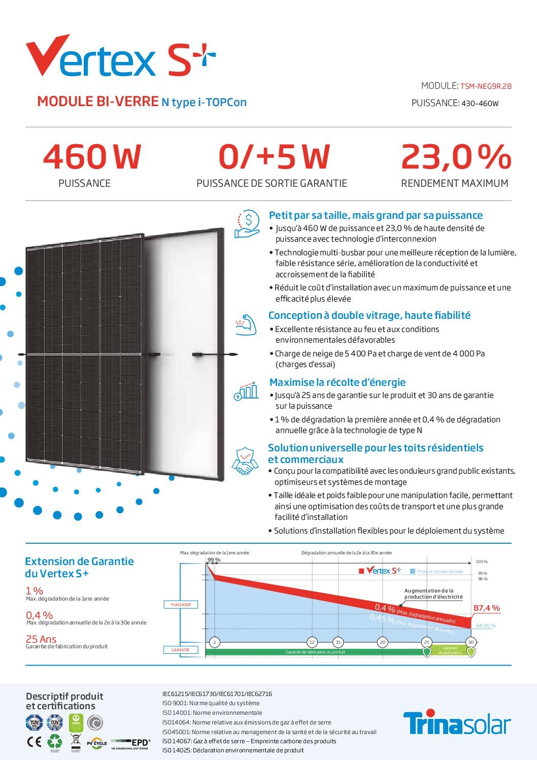 The Vertex S+ series represents Trina Solar’s commitment to innovation and sustainability. With dual-glass encapsulation, these modules offer better mechanical strength, reduced degradation, and long-term performance even in extreme environments.